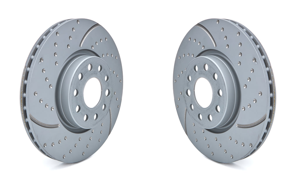 EBC BRAKES USA INC Brake Rotor Kit Turbo Front Volkswagen Golf GD1386 Brake Rotor - GD Sport - Front - Directional / Dimpled / Slotted - 12.300 in OD - Iron - Gray Paint - Audi 2006-24 / Volkswagen 2005-24 - Pair
