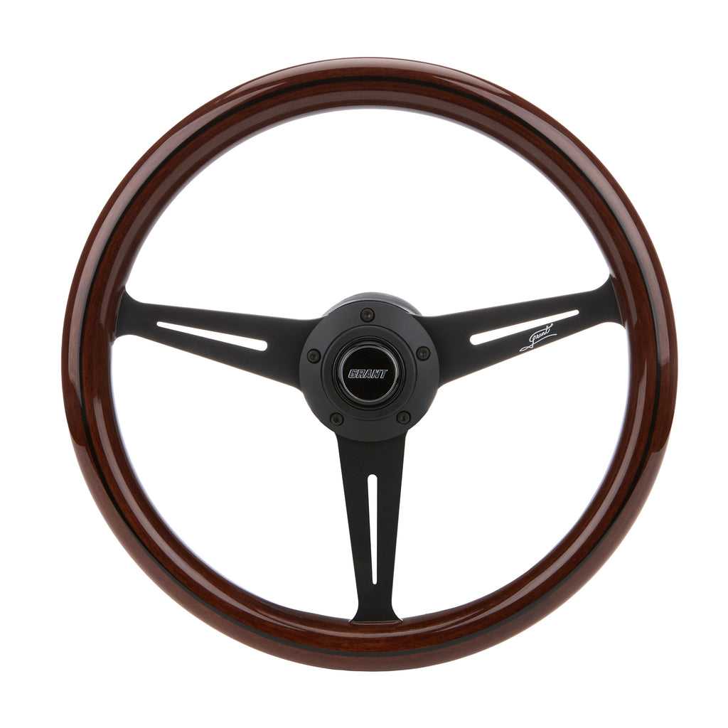 GRANT Collectors Black Line Mahogany Grip Black Sp 1176 Steering Wheel - Classic Series - 14.5 in Diameter - 1.5 in Dish - 3-Spoke - Mahogany - Wood Grip - Aluminum - Black Anodized - Each