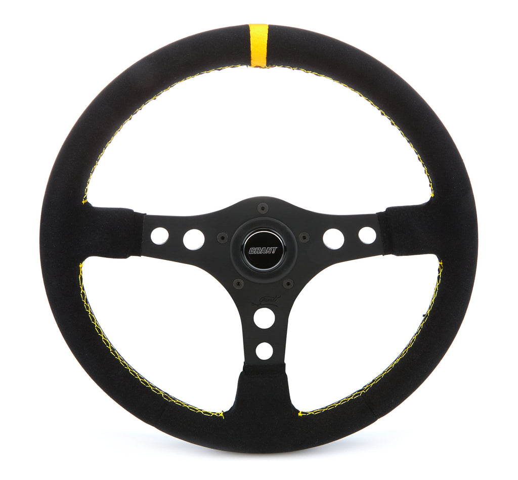 GRANT Formula GT Suede Wrapped 774-S Steering Wheel - 14 in Diameter - 1.75 in Dish - 3-Spoke - Black Suede Grip - Yellow Stripe - Aluminum - Black Anodized - Each