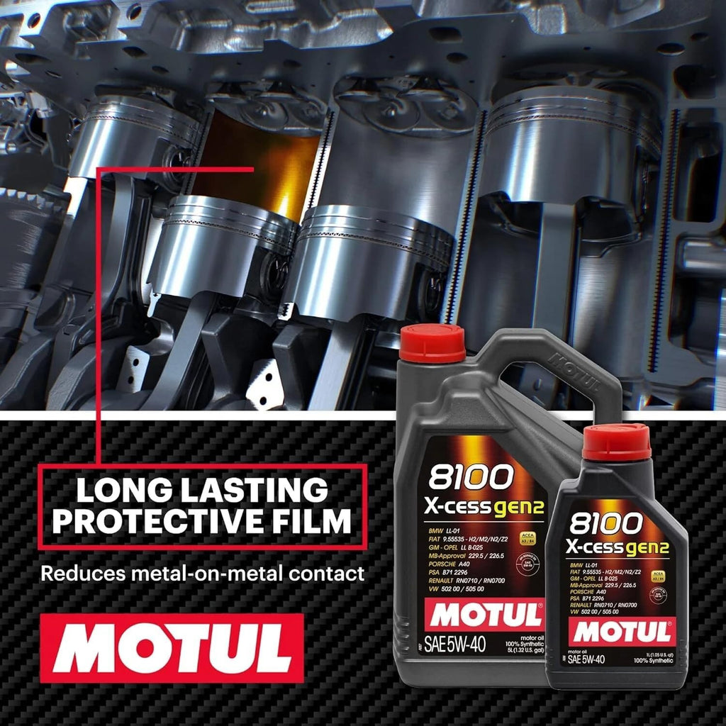 Trusted worldwide by European automakers, this 5W-40 European car oil meets and exceeds ACEA A3/B4 and API SN/CF specifications — making it ideal for diesel 5W-40 or gasoline 5W-40 applications. no matter the car you drive, the Motul 5W-40 8100 X-cess Gen2 delivers unmatched stability and film strength.