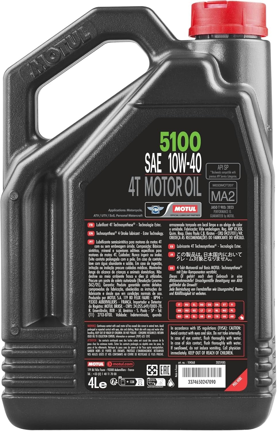 Whether you ride a sportbike, cruiser, dirt bike, or touring motorcycle, Motul 5100 10W-40 ensures consistent oil pressure and smoother clutch engagement under all conditions. Designed with high detergent additives, it reduces carbon buildup and friction, helping your engine run cleaner and more efficiently.