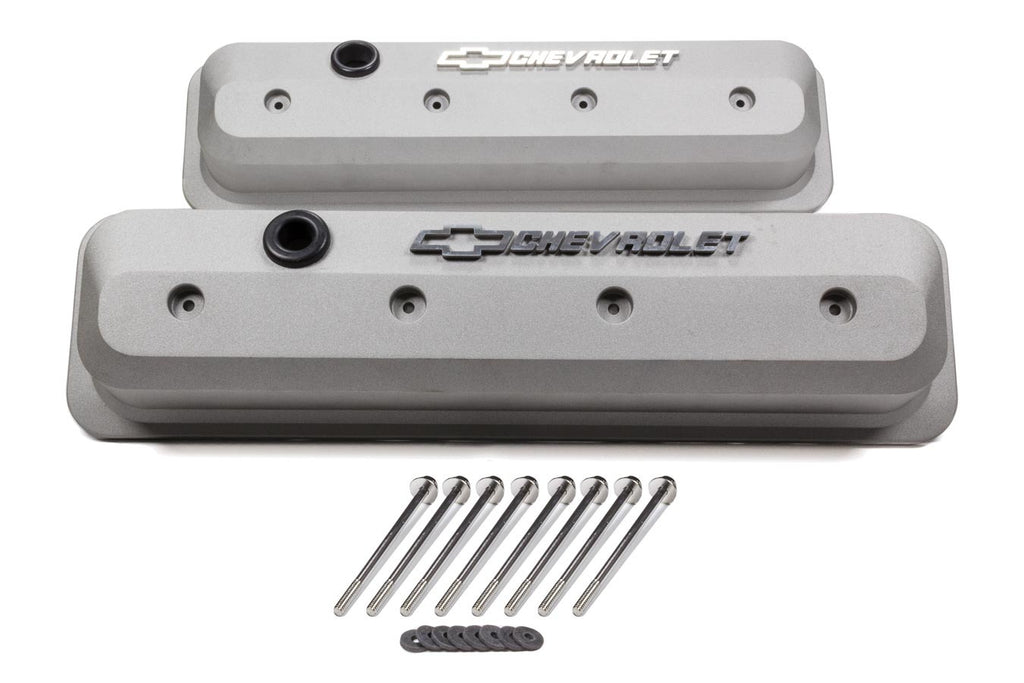 Valve Cover - Slant-Edge - Tall - Baffled - Breather Hole - Raised Milled Chevrolet Logo - Aluminum - Gray Crinkle Powder Coat - Small Block Chevy - Pair