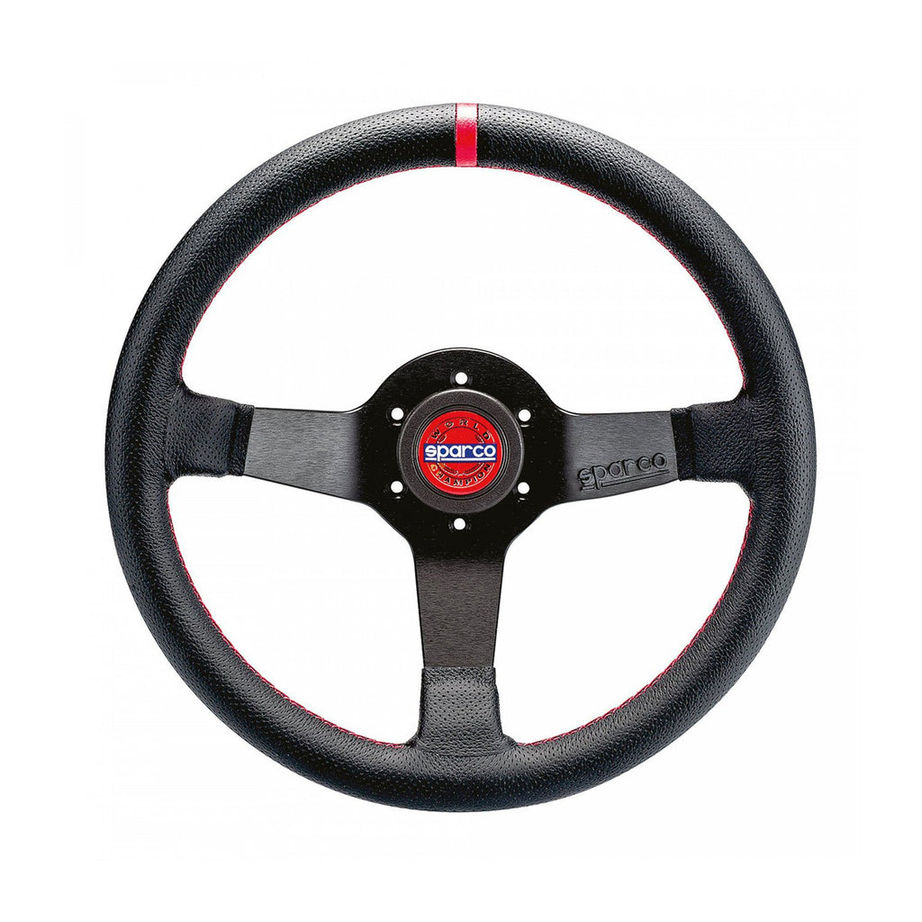 SPARCO Steering Wheel Champion 015R330CHAMPION Steering Wheel - Champion - 330 mm Diameter - 66 mm Dish - 3-Spoke - Black Leather Grip - Red Stripe - Aluminum - Black Anodized - Each